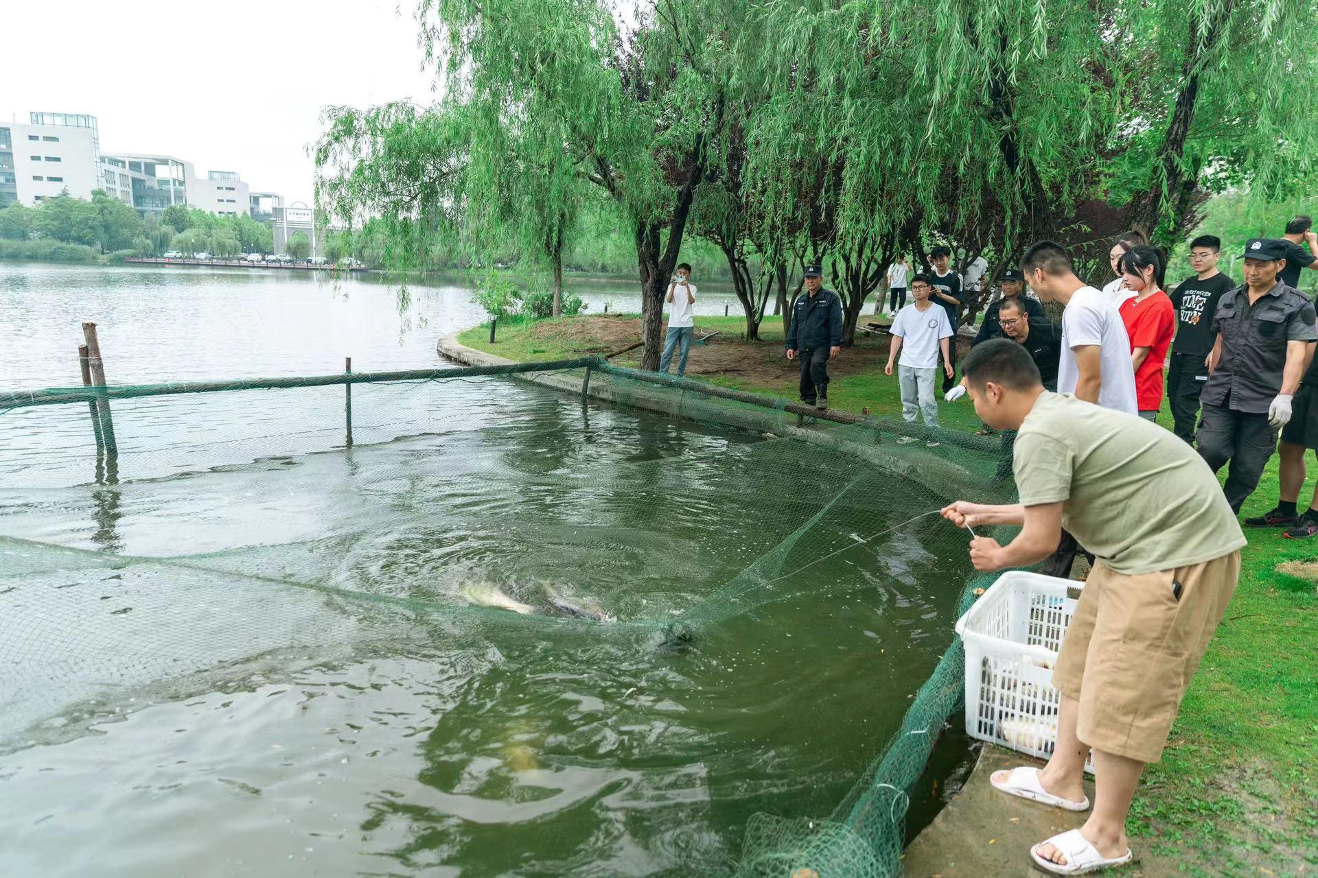 校庆日当天,校党委书记刘波、副校长赵建岭、校党委副书记李江涛来到梅苑餐厅参加师生免费品尝“校庆鱼”活动,并与现场师生亲切交流。今年是学校请师生免费品尝“校庆鱼”的第7年。本次活动共从镜湖里捕获各类鱼2133斤,经食堂加工成红烧鱼、清蒸鱼、红剁椒鱼和黄剁椒鱼等美食后,在桃苑餐厅一层、美食广场二层和梅苑餐厅一层共设置6个“免费镜湖鱼”窗口供师生免费品尝。本次活动还精心布置了“全鱼宴”展台,展台现场精心遴选出的24道切合校庆气氛的全鱼宴菜品错落有致地陈列,引得过往师生纷纷驻足观赏、品尝。