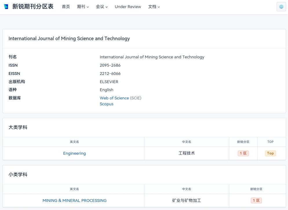 3月24日,2026年期刊分区表发布并更名为《新锐期刊分区表》(简称“新锐分区”)。我校主办的International Journal of Mining Science and Technology(《国际矿业科学技术学报(英文)》,简称IJMST)入选“工程技术”大类学科1区(Top期刊)和“矿业与矿物加工”小类学科1区,在全球“工程技术”大类学科1493种国际期刊中排名第7位,非综述类的工程技术期刊中排名第4位。此外,我校主办的创刊仅三年半的Deep Underground Science and Engineering(《深地科学(英文)》,简称DUSE)入选“工程技术”大类学科1区(1493种国际期刊中排名第109位)和“工程:地质”小类学科2区(66种国际期刊中排名第11位)。