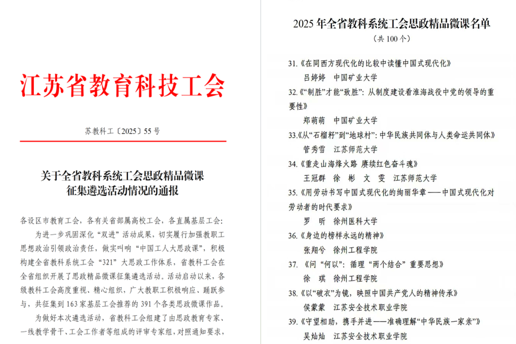 活动启动以来,我校工会高度重视,迅速部署落实相关工作,与教务部、马克思主义学院等单位多次沟通,鼓励教职工结合自身专业领域申报作品。最终,我校吕婷婷老师的《在同西方现代化的比较中读懂中国式现代化》、郑萌萌老师的《“制胜”才能“致胜”:从制度建设看淮海战役中党的领导的重要性》两门微课成功入选。作品分别从中国式现代化理论阐释、党史学习教育角度切入,以深刻的内容、新颖的形式赢得评审专家认可,充分体现了我校思政课程建设的扎实功底与创新能力。