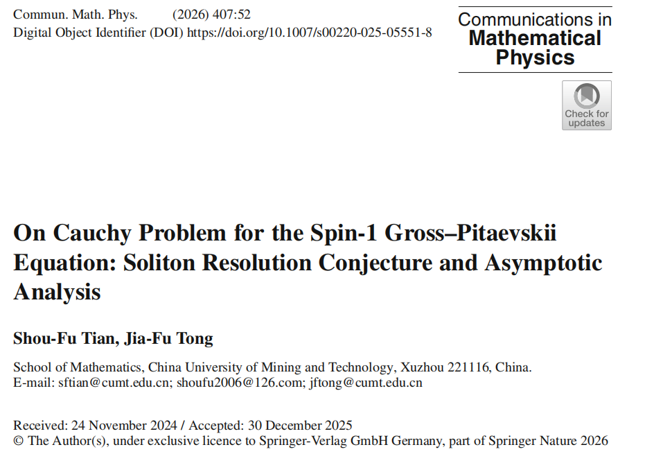 近期,我校数学学院田守富教授带领其在读博士童家福,在国际顶级数学期刊《Communications in Mathematical Physics》上发表题为《On Cauchy Problem for the Spin-1 Gross-Pitaevskii Equation: Soliton Resolution Conjecture and Asymptotic Analysis》的学术论文,论文共69页。在该论文中,作者发展反散射理论结合Dbar问题对具有高阶Lax谱问题的spin-1Gross-Pitaevskii(GP)方程的解进行了完整的长时间渐近分析,证明了高阶谱可积方程著名的孤子分解猜想,解决了N孤子解的渐近行为分析难题,为解决高阶可积系统渐近性问题提供了理论框架。