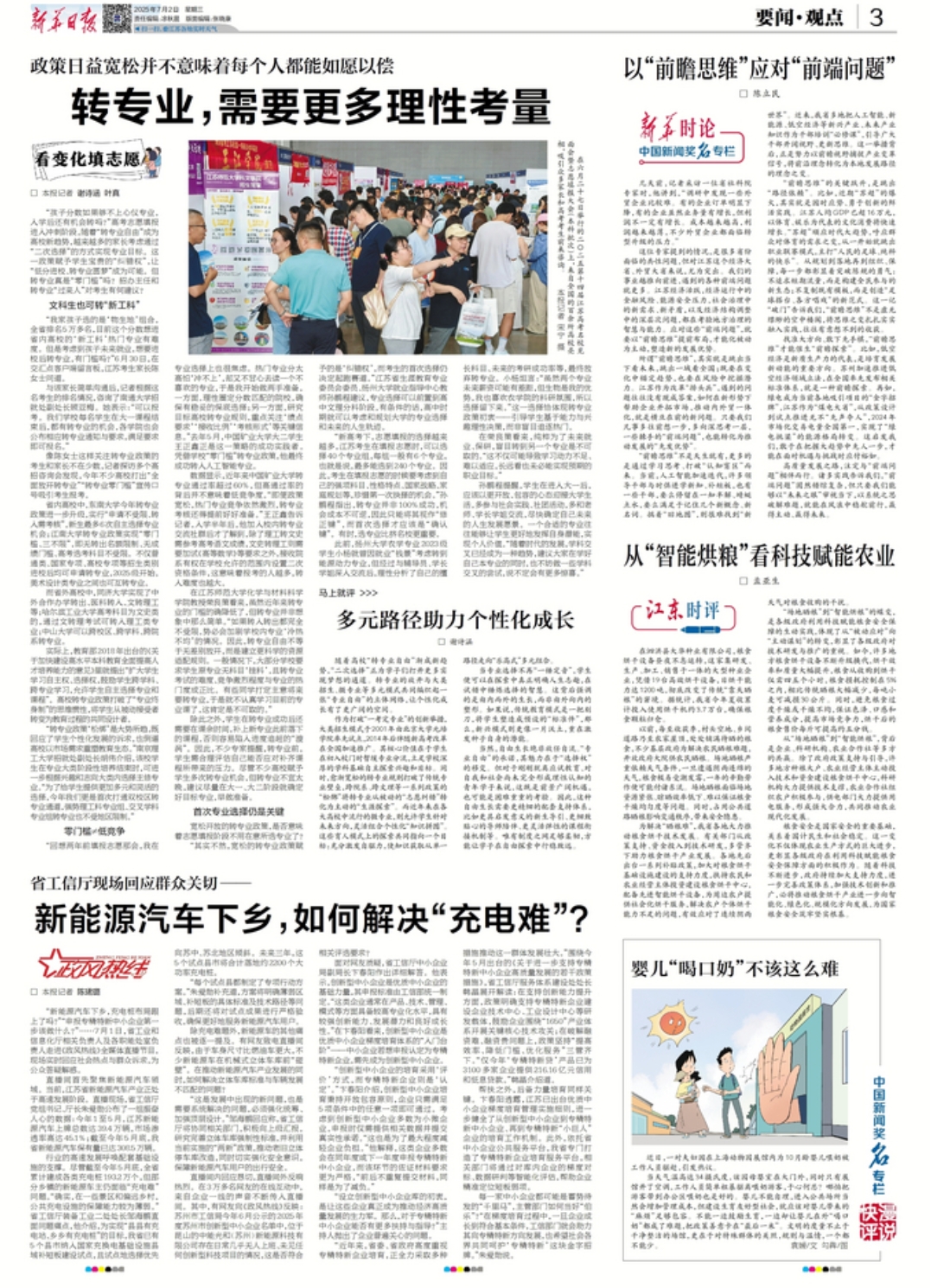 省内高校中,东南大学今年转专业政策进一步升级,实行“申请不受限、转入需考核”,新生最多6次自主选择专业机会;江南大学转专业政策实现“零门槛、三不限”,即无转出名额限制、无成绩门槛、高考选考科目不受限。不仅普通类、国家专项、高校专项等招生类别进校后均可申请转专业,2025级开始,美术设计类专业之间也可互转专业。