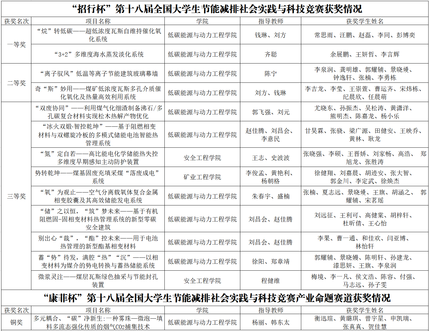本届大赛以“绿色低碳,奔向未来”为主题,吸引了全国692所高校参与,共收到7736件有效作品,并汇聚了来自85所高校的254件产业赛道作品,赛事规模创历史新高。经过网评、会评的激烈角逐,最终131所高校的338件(含20件产业赛道作品)优秀作品脱颖而出,会师决赛现场。在为期两天的决赛中,参赛队伍通过现场路演和集中答辩等环节展开精彩角逐,竞逐绿色科技巅峰。我校“‘烷’转低碳—超低浓度瓦斯自维持催化氧化系统”和“3+2多维度海水蒸发淡化系统”项目获一等奖。本届比赛同时公布了百篇全国能源动力类本科生优秀毕设获奖名单,我校3篇毕业设计入选。