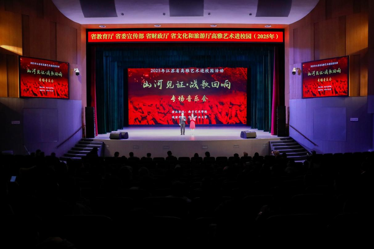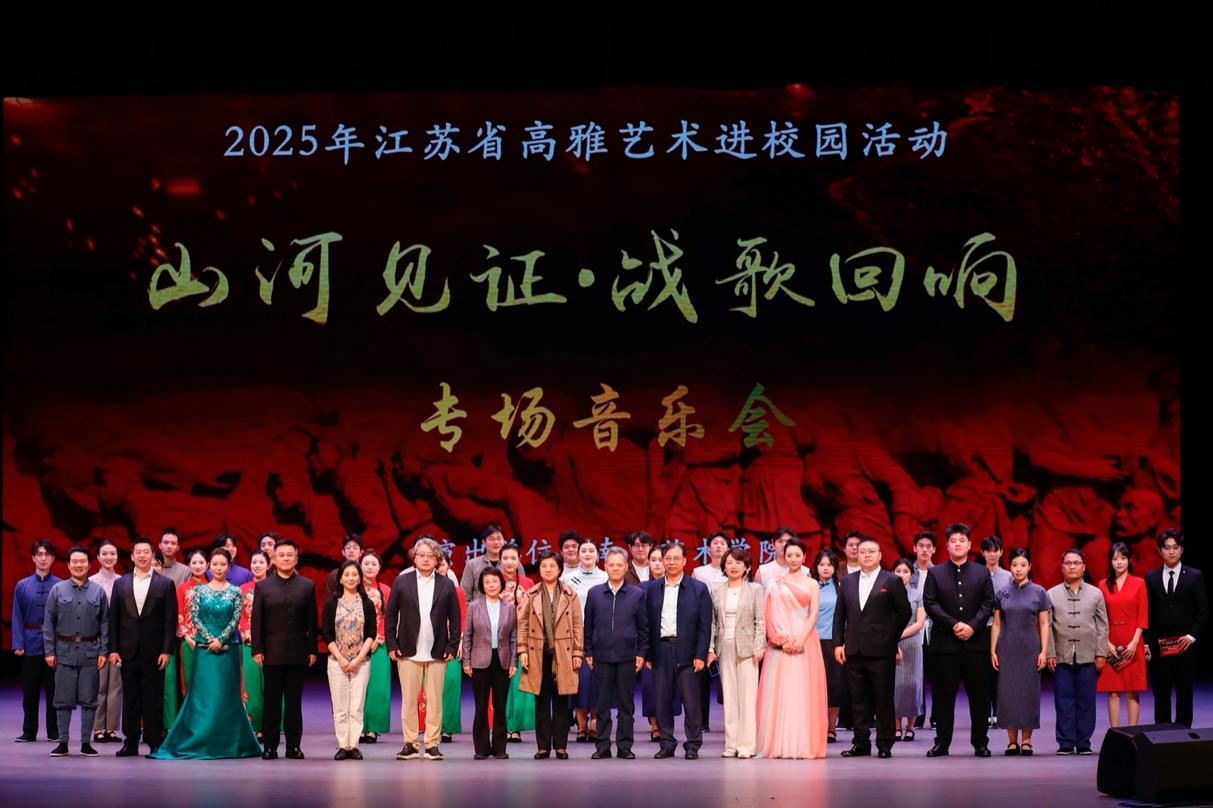 10月17日晚,2025年江苏省高雅艺术进校园活动——南京艺术学院“山河见证·战歌回响”专场音乐会在我校明德礼堂举行。本次音乐会以中国人民抗日战争暨世界反法西斯战争胜利80周年为背景,通过“爱国情怀、民族气节、英雄气概、必胜信念、时代领航”五大主题篇章,将红色音乐与思政教育深度融合,为我校师生带来一场沉浸式的精神洗礼。徐州市人大常委会副主任、民革徐州市委主委李燕,校党委副书记蔡世华,江苏师范大学校长杜增吉,南京艺术学院副校长苗雨,民进徐州市委会主委、徐州市文联主席郭开芬等出席活动。
