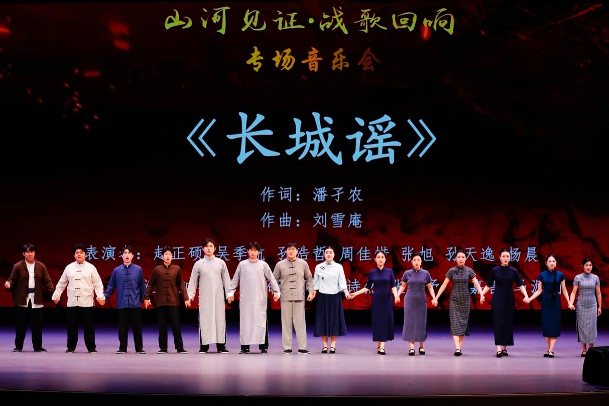 音乐会以《长城谣》拉开序幕,五大篇章层层递进,通过音乐叙事传承伟大抗战精神。爱国情怀篇中,《松花江上》《黄河怨》等曲目以悲怆旋律再现民族苦难,控诉战争暴行;民族气节篇以《嘉陵江上》《抗敌歌》等作品,展现知识分子以音乐为武器的文化担当;英雄气概篇通过《游击队歌》《延安颂》等经典曲目,重现军民团结抗战的不屈历程,其中《延安颂》将演出推向高潮;必胜信念篇以《毛主席的话儿记心上》《弹起我心爱的土琵琶》等作品,传递革命乐观主义精神与奋斗力量;时代领航篇则以《把一切献给党》《领航》等歌曲,讴歌新时代同心筑梦的赤诚情怀。演出尾声,全场齐唱《歌唱祖国》,磅礴歌声凝聚起铭记历史、砥砺前行的青春力量。