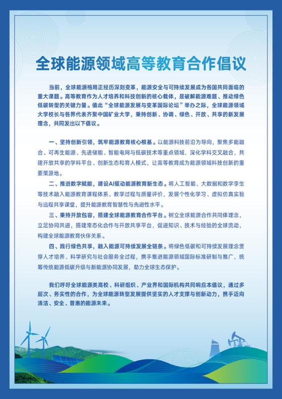 倡议呼吁全球能源类高校、科研组织、产业界和国际机构共同响应,通过多层次务实合作,为全球能源转型发展提供坚实的人才支撑与创新动力,携手迈向清洁、安全、普惠的能源发展未来。