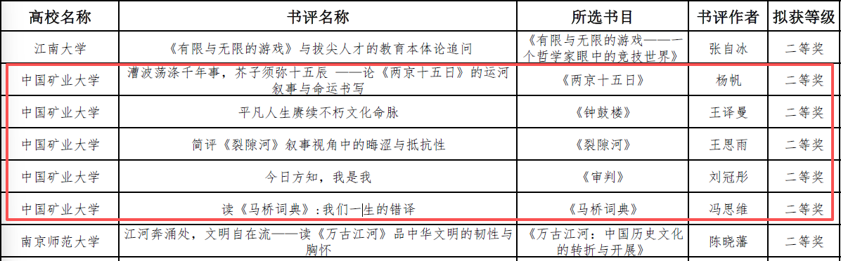 本届江苏大学生书评大赛由江苏省教育厅主办、江苏省高等教育学会协办,59所高校参与申报,共评选出获奖作品220个。我校组织报送的5篇书评作品获奖:《漕波荡涤千年事,芥子须弥十五辰》(作者:杨帆)、《平凡人生赓续不朽文化命脉》(作者:王译曼)、《简评〈裂隙河〉叙事视角中的晦涩与抵抗性》(作者:王思雨)、《今日方知,我是我》(作者:刘冠彤)、《读〈马桥词典>:我们一生的错译》(作者:冯思维)。