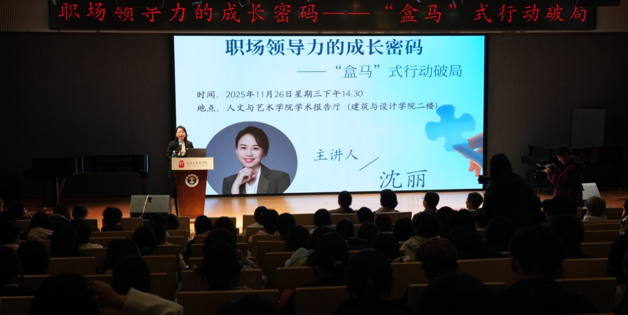 11月26日下午,人文与艺术学院广播电视专业2004届优秀校友、盒马联合创始人、上海花花讲堂创始人沈丽在学院报告厅作了题为“职场领导力的成长密码——‘盒马’式行动破局”的讲座。人文学院党委副书记姜媛、新闻传播学系部分教师及200余名同学参加了讲座。