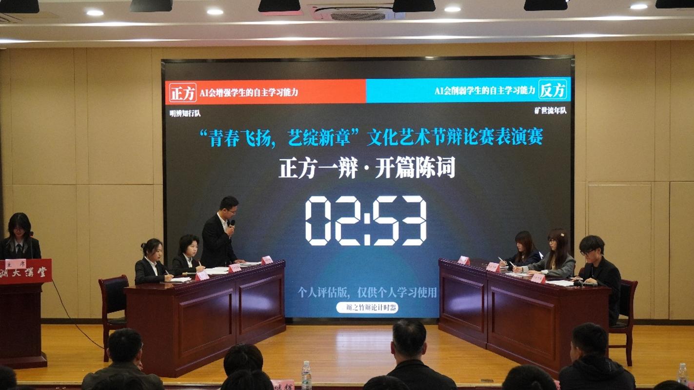 本次表演赛以“AI会增强/削弱学生的自主学习能力”为辩题,正方“明辨知行”队与反方“矿世流年”队展开了激烈交锋。双方辩手结合校园学习实际,凭借严谨的逻辑与富有感染力的表达,围绕辩题层层辩驳。在开篇立论、攻辩交锋、自由辩论等环节中各展所长,生动诠释了青年学子面对技术变革的求知欲与思辨力,为现场师生呈现了一场兼具思想深度与青春活力的辩论盛宴。