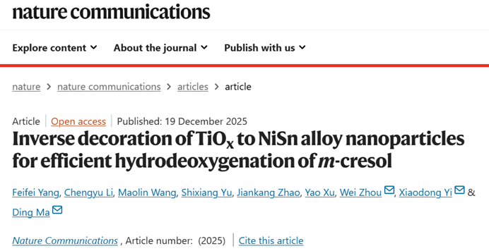 上述研究成果以“Inverse decoration of TiOx to NiSn alloy nanoparticles for efficient hydrodeoxygenation of m-cresol”为题,于近日发表于国际知名学术期刊《Nature Communications》。