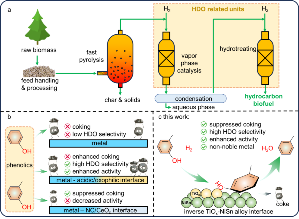 催化加氢脱氧是低阶煤和生物质衍生酚类化合物转化为精细化学品和特种油品的关键技术。然而,酚类化合物黏度大、稳定性差,在常压条件下催化剂易因快速积碳而失活,成为制约该技术发展的主要瓶颈。针对这一难题,研究团队设计制备了TiOx修饰的NiSn/SiO2催化剂。实验结果表明,在350 °C、常压氢气的温和反应条件下,该催化剂在间甲酚的加氢脱氧反应中表现出优异的性能——脱氧选择性接近100%,且抗积碳能力与稳定性显著优于传统催化剂。机理研究表明,其卓越性能源自三方面优势的协同作用:TiOx与NiSn合金形成的独特界面有效降低了C-O键断裂的能垒;Sn的引入抑制了过度加氢等副反应,减少了积碳前驱体的生成;而创新的“反向修饰”策略在构建高效活性界面的同时,最大限度减少了易导致积碳的酸性位点。该工作不仅开发出一种具有潜在应用前景的高性能催化剂,更为理性设计高效稳定的加氢脱氧催化剂提供了具有普适性的新策略,对推动低阶煤和生物质资源的高值化利用具有重要的科学价值与应用前景。