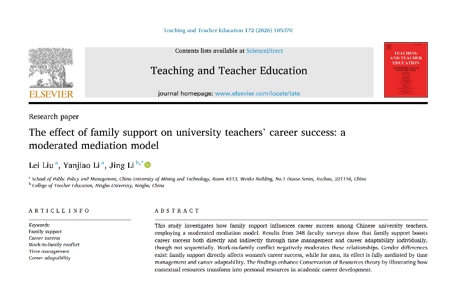 近日,我校公共管理学院(应急管理学院)刘蕾教授在教育学领域顶级期刊《Teaching and Teacher Education》发表题为“The effect of family support on university teachers’ career success: a moderated mediation model”的学术论文。该期刊为中科院一区、SSCI一区期刊,在教育学领域、特别是教师发展领域具有重要学术影响力。