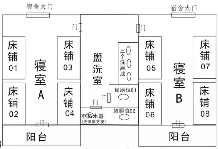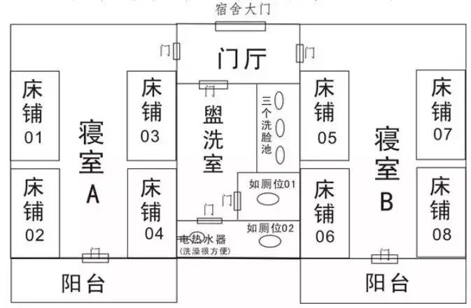 在这里顺便提下,南湖校区的宿舍分为五个区域:桃苑、梅苑、松苑、竹苑和杏苑。右图为梅苑、松苑、竹苑和杏苑的结构图,桃苑构造略有不同,其宿舍大门开在中间的盥洗室而不是两边的小宿舍,盥洗室有门厅,具体可参见左图。