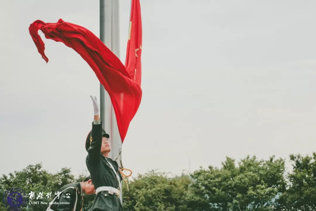 一名旗手,两名护旗手,肩负军训旅的旗帜。这面旗帜凝结了教官日夜教导的辛劳,学生刻苦训练的汗水,是2019级新生共同的守护。
