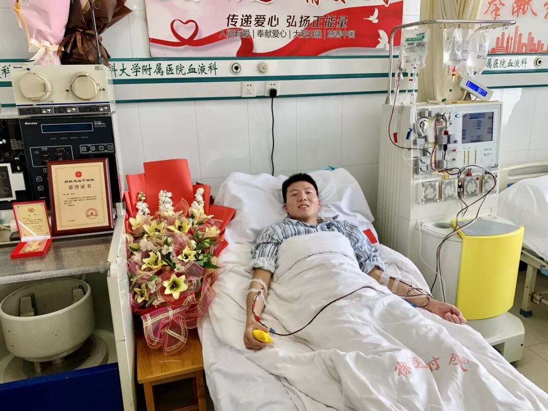 岁的矿大小伙何军正在进行造血干细胞采集。他所捐献的造血干细胞,将用于挽救省内一名