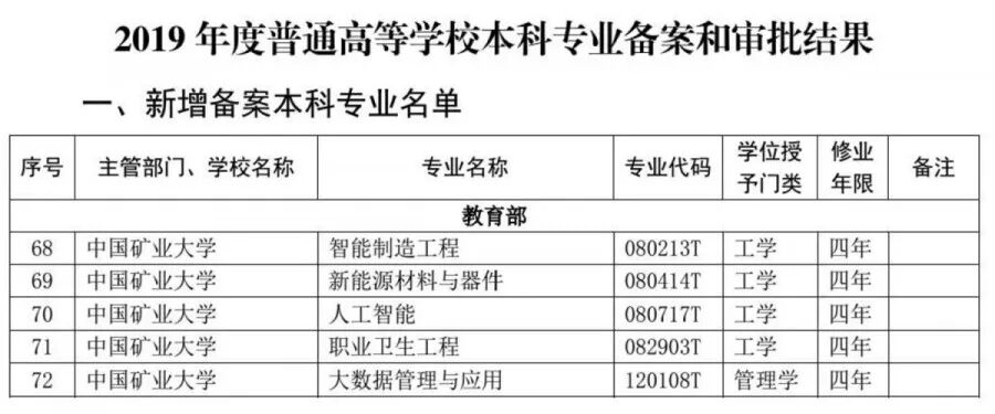近日,教育部公布了2019年度普通高等学校本科专业备案和审批结果,中国矿业大学人工智能、职业卫生工程、智能制造工程、新能源材料与器件、大数据管理与应用5个新专业全部通过教育部备案。我校新增专业数量并列全省第一位。