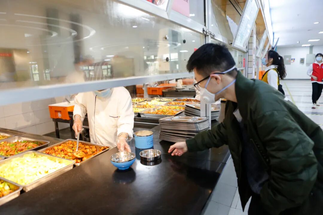 环测学院16级的龚同学和舍友一起在饮食服务中心就餐疏导点购买盒饭。这也是她返校后的第一顿饭,“我买的十元套餐,有鱼有蔬菜,一荤两素”,“感觉就餐很方便,超市也正常营业,买东西很方便,学校真的考虑的很周到”,她告诉小编,“这两天都有老师来宿舍,带来消毒用品,指导我们做好宿舍卫生,感觉很安心”。
