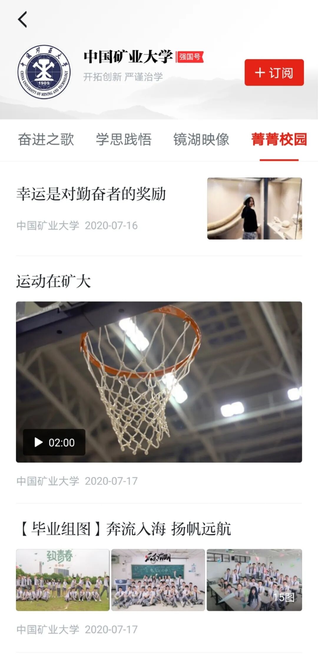 搜索栏直接搜索“中国矿业大学”,点击右上角“订阅”。也可通过扫码订阅哦