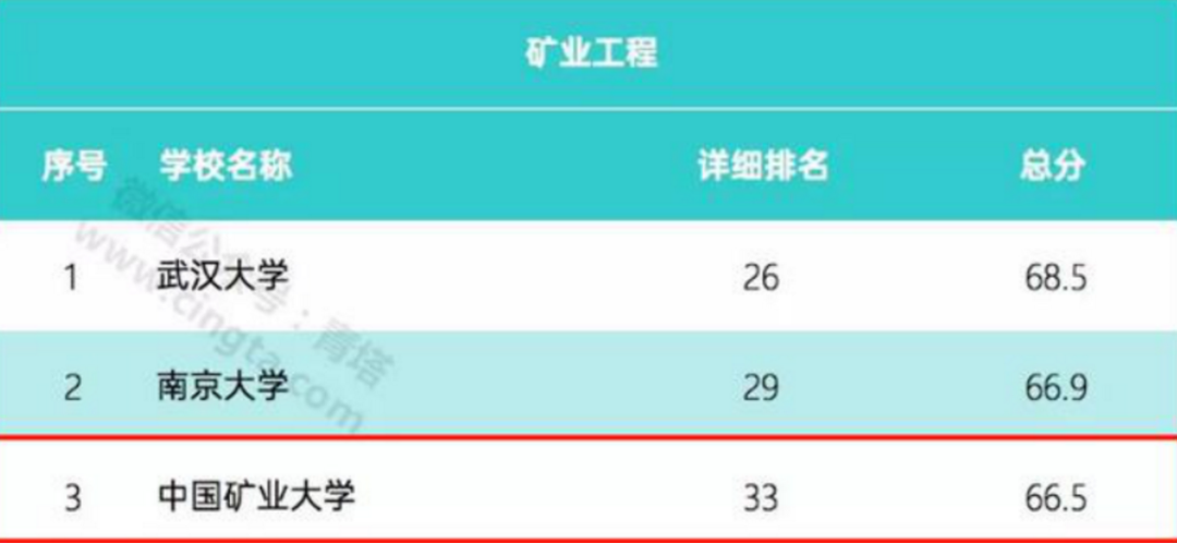 2020年3月3日,世界权威榜单发行机构QS全球教育集团发布了第十次世界大学学科排名。本次排名评估了全球83个国家地区的1368所高校。中国矿业大学矿业工程学科位列世界第33位,较去年前进3位。