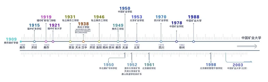 中国矿业大学的前身是创办于1909年的焦作路矿学堂,自建校以来,矿大经历了十四次搬迁、十二次易名。百余年来,学校历经艰辛,颠沛流离,但始终与祖国共命运,与时代同进步,谱写了一曲曲爱国奉献的华彩乐章。