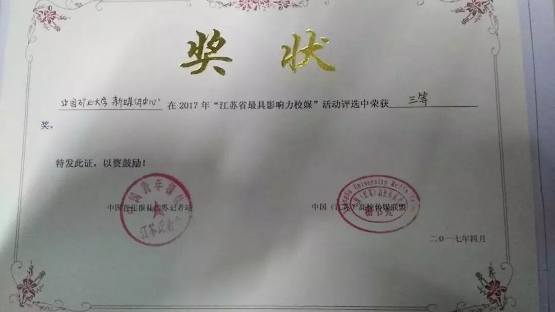 中国矿业大学新媒体中心在2017年“江苏省最具影响力校媒”活动评选中荣获三等奖。