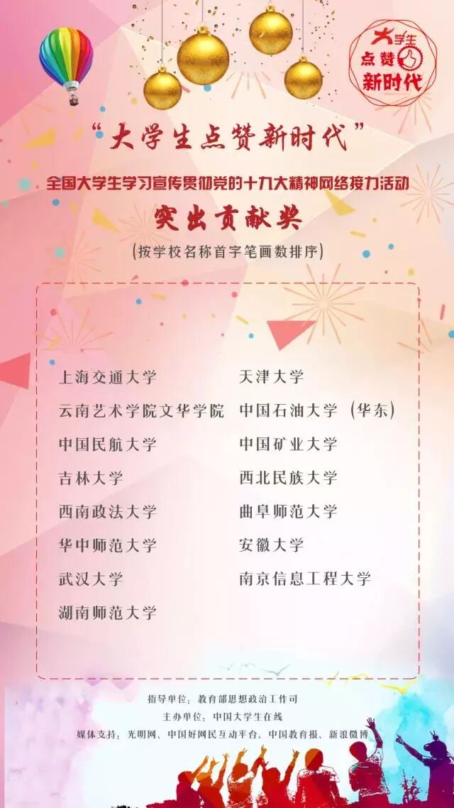 在由教育部思想政治工作司指导,中国大学生在线主办的“大学生点赞新时代”全国大学生学习宣传贯彻党的十九大精神网络接力活动中,中国矿业大学荣获“突出贡献奖”。