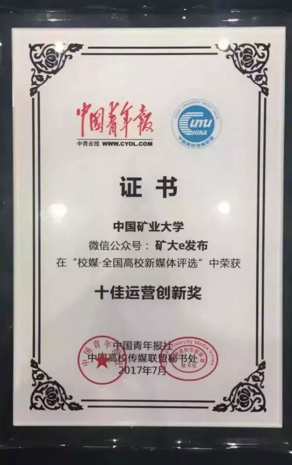 中国矿业大学官方微信“矿大e发布”在由中国青年报、中国高校传媒联盟主办的“2017校媒精英暨校媒·全国高校新媒体评选颁奖典礼”中荣获“十佳运营创新奖”。