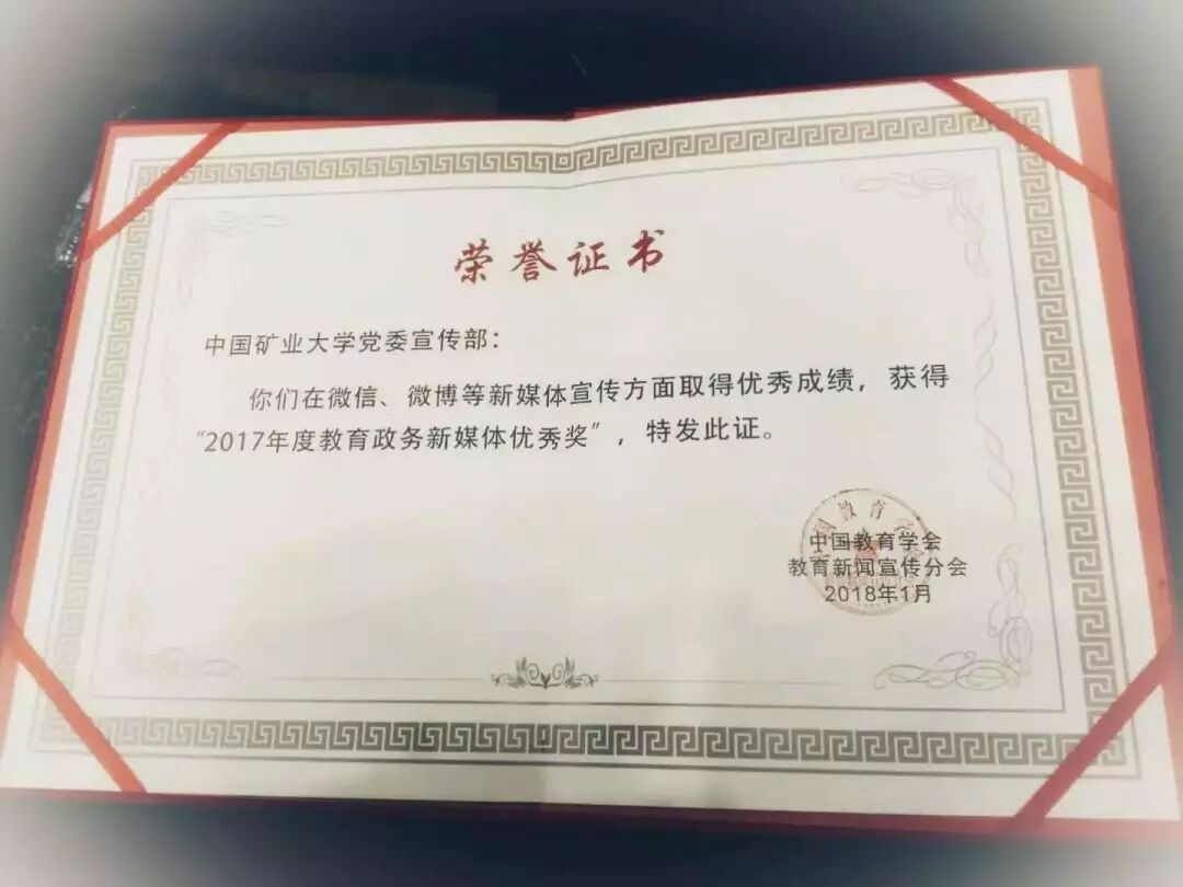 2017年1月17日-19日,在2017年中国教育政务新媒体年会中,中国矿业大学官方微博、微信获得2017年度教育政务新媒体优秀奖。这是我校首次在教育政务新媒体中获奖。