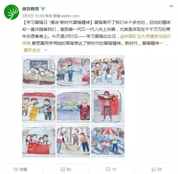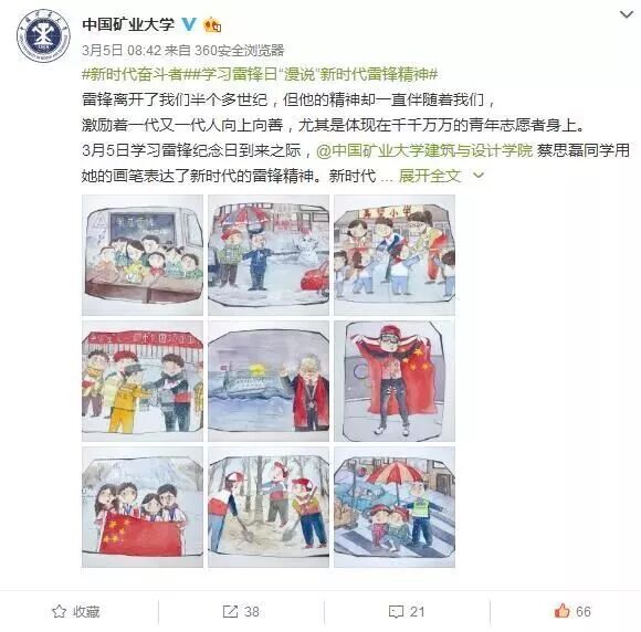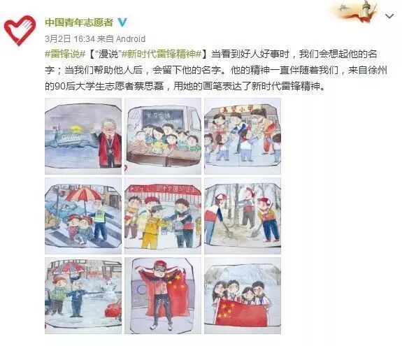 当谈到为什么想要画关于雷锋的漫画时候,蔡思磊说到:雷锋,是一个时代的印记,他爱岗敬业,乐于助人,用他自己的方式诠释青春的意义。雷锋精神凝聚着我们无数时代的记忆,是中华民族传统美德的体现,我们身边也有许许多多的普通人,他们默默地诠释着新时代的“雷锋”精神,我希望能通过笔下的漫画来表达我对雷锋精神的理解,也向身边的“雷锋们”表达敬意。