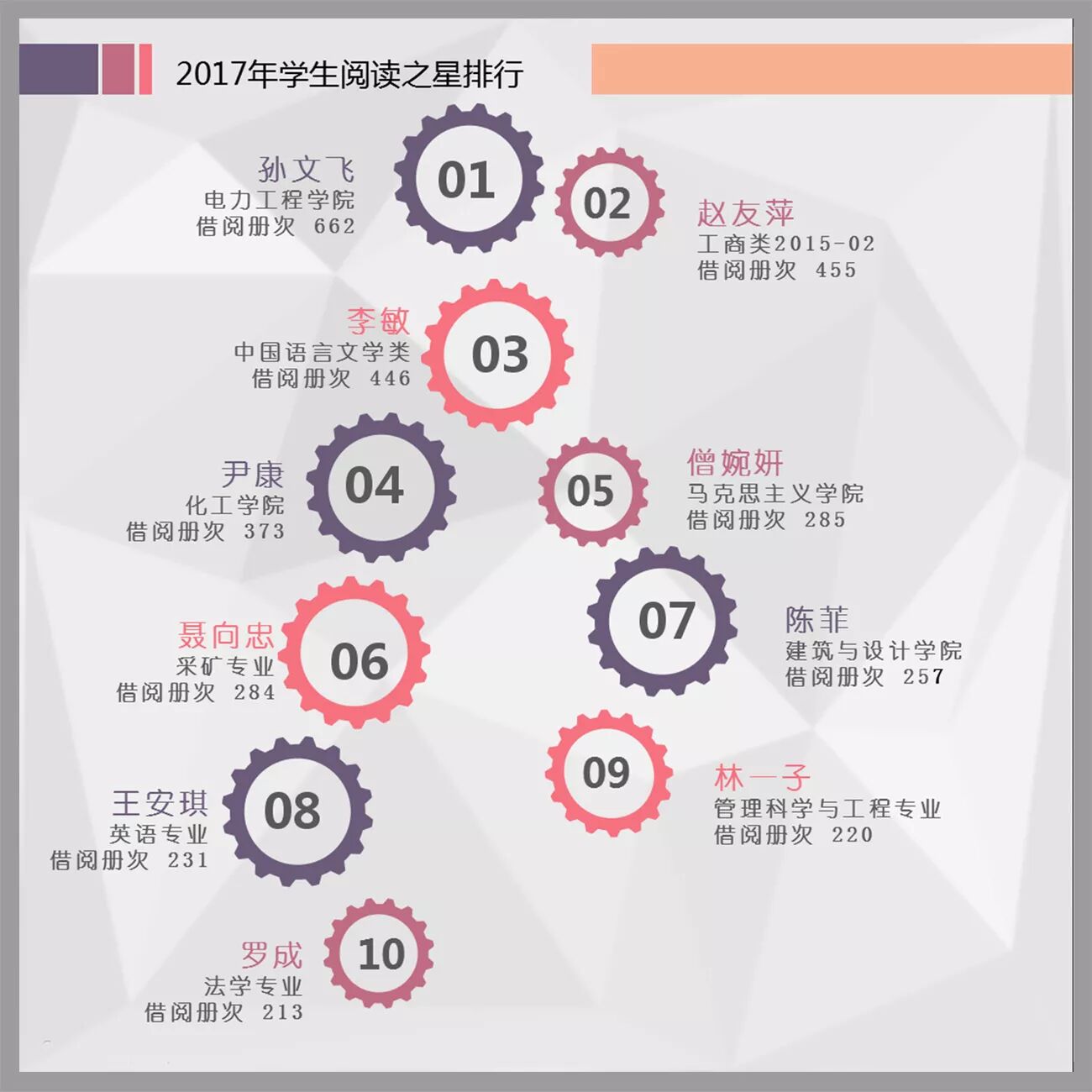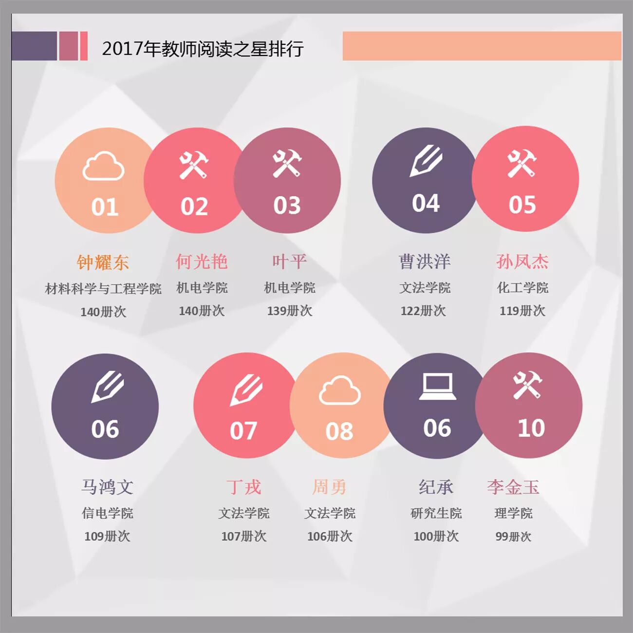 对比2016年借阅图书排行榜,李金玉、叶平、钟耀东、曹洪洋、马鸿文再次位列教师借阅前10名。厉害了,我的老师们!