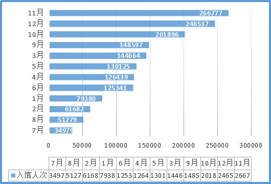 2017年南湖入馆总人次为1,617,696人次,其中单月11月入馆人次最高,为266,777人次;单日12月23日入馆人次最高,为12,964人次。年度总入馆较2016年少了297,924 人次,下降了15.55%,但比14年和15年有所上升。