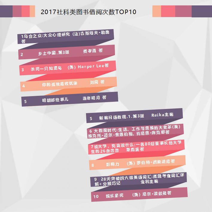 社科类借阅榜首的是法国作家庞勒在1895年写下的心理学作品《乌合之众》,虽然距离它的问世已经时隔100多年,但其中的很多观点对现在的我们也有着很大的启发,受到了同学们的追捧。