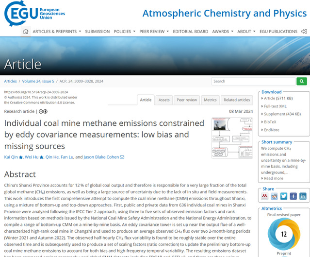 该研究的相关成果以两篇论文的形式发表,一篇以“Individual Coal Mine Methane Emissions Constrained by Eddy Covariance Measurements: Low Bias and Missing Sources”为题,发表在《Atmospheric Chemistry and Physics》(中国科学院1区TOP期刊),秦凯教授为论文第一作者,Jason Cohen教授为论文通讯作者。另一篇以“基于高分五号卫星的山西省煤炭行业甲烷点源排放特征研究”为题,发表在《煤炭学报》,秦凯教授为论文通讯作者。
